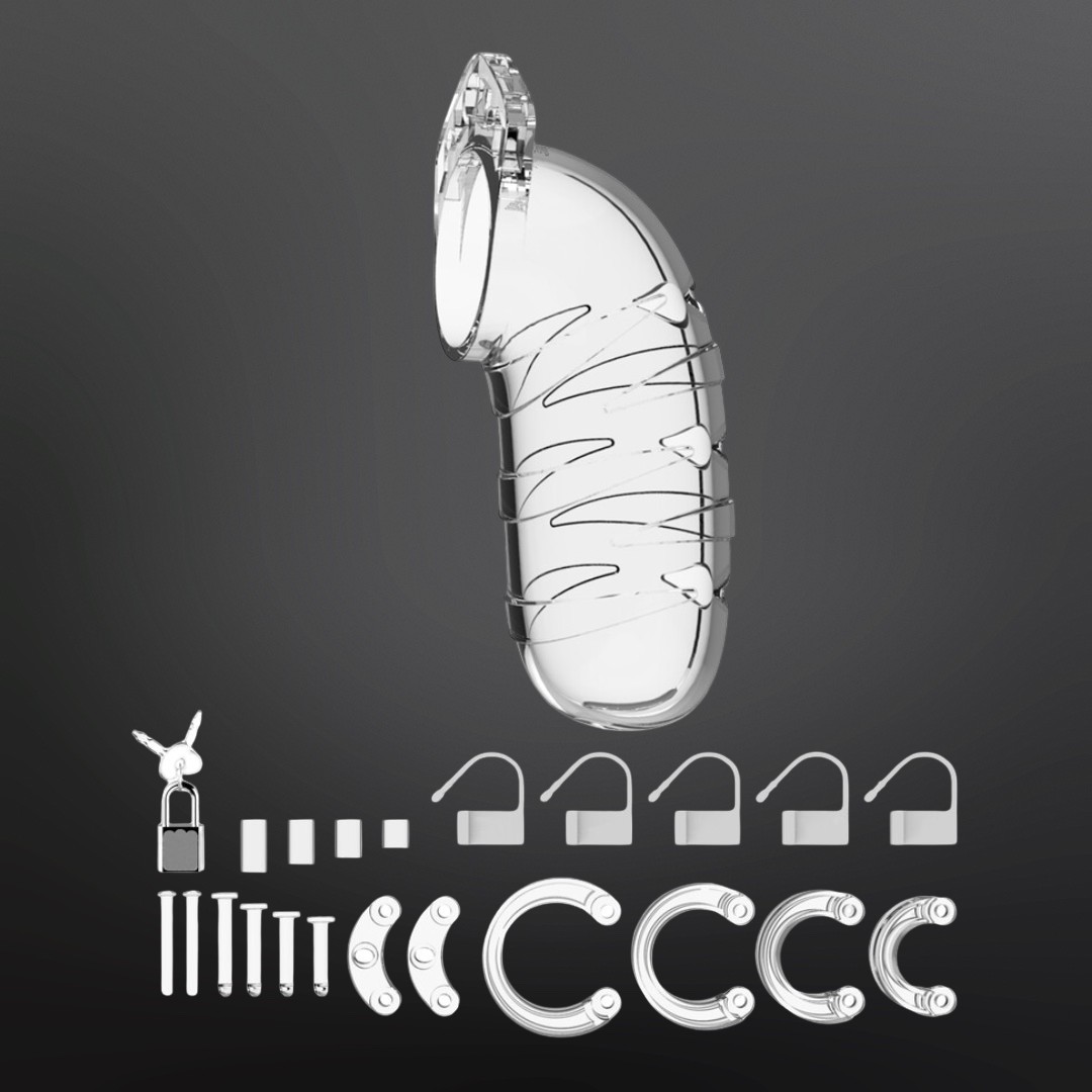 La cage de chasteté est fabriquée en polycarbonate de qualité, léger, robuste et sans phtalates, conçu pour résister aux usages répétés. Le dispositif se compose de trois parties qui s’emboîtent précisément : la chambre de 14 cm, les goupilles de guidage et la tige conique qui relie l’anneau de base à la cage. Plusieurs anneaux fournis permettent d’ajuster le serrage autour de la base du sexe et des couilles, pour adapter la contrainte à la morphologie et au niveau de jeu recherché. Des ouvertures de ventilation et une ouverture dédiée à la miction facilitent l’hygiène quotidienne et évitent de devoir retirer la cage pour le passage aux toilettes. Entièrement étanche, la Man Cage Model 05 se porte aussi sous la douche, ce qui simplifie le nettoyage et le port continu.
