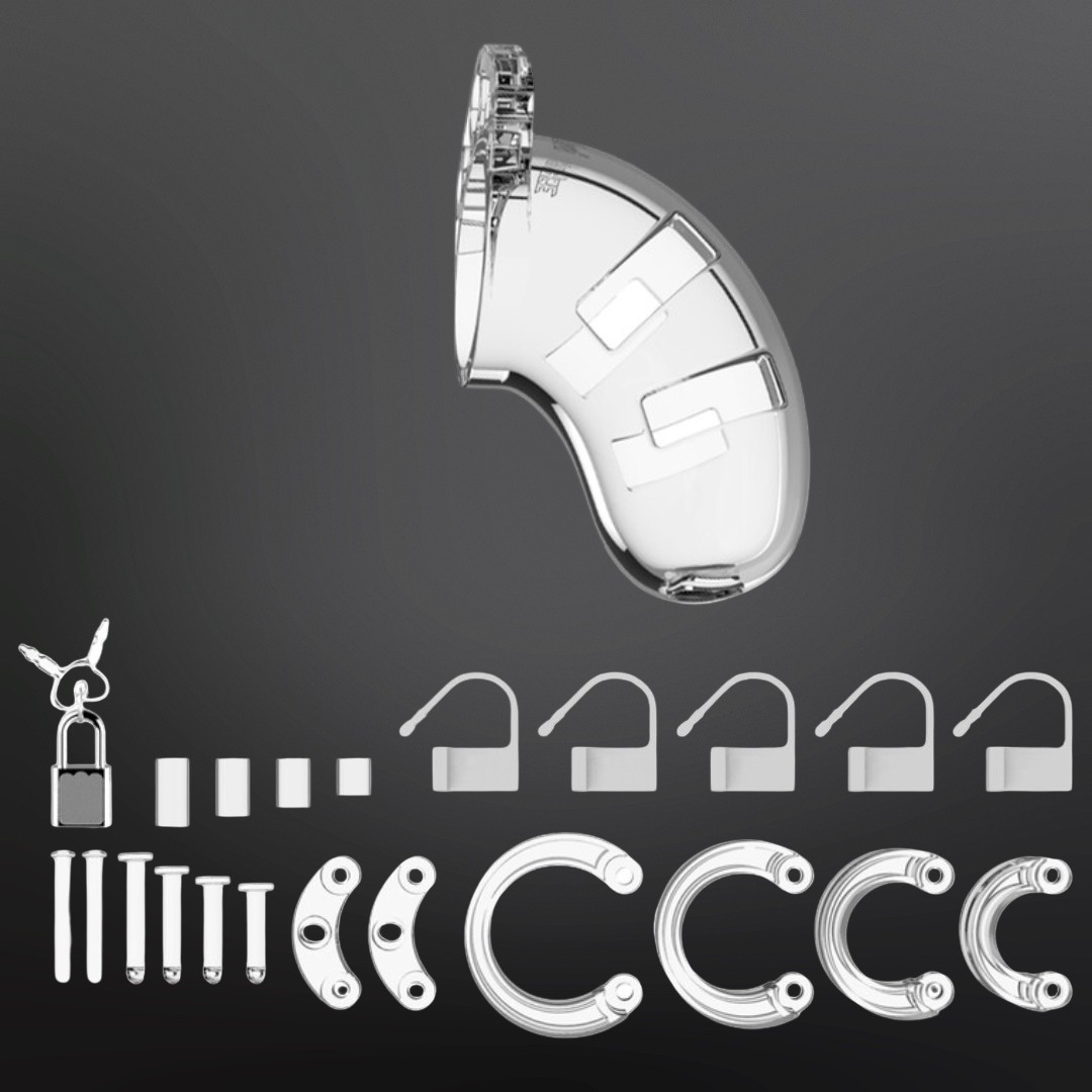 Moulée en polycarbonate rigide, la cage ne se déforme pas et maintient la queue strictement contenue. Les pièces s’emboîtent autour de l’anneau choisi grâce à un jeu d’entretoises permettant un ajustement précis. Une large ouverture frontale facilite l’urination directe, tandis que les fentes latérales assurent une ventilation permanente et un nettoyage simplifié sans démontage. Le système permet un verrouillage rapide et fiable, adapté aux scénarios de port discret, de domination ou de discipline longue durée.