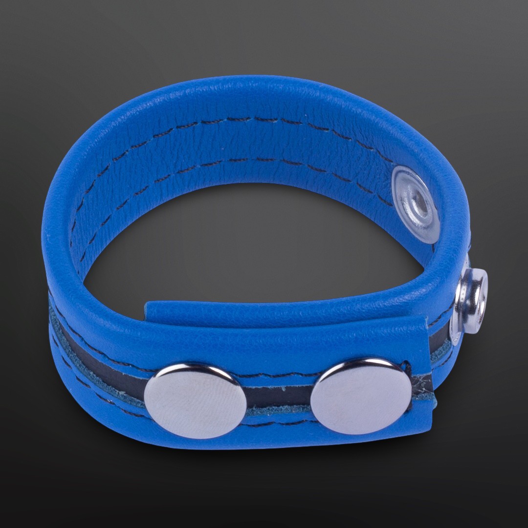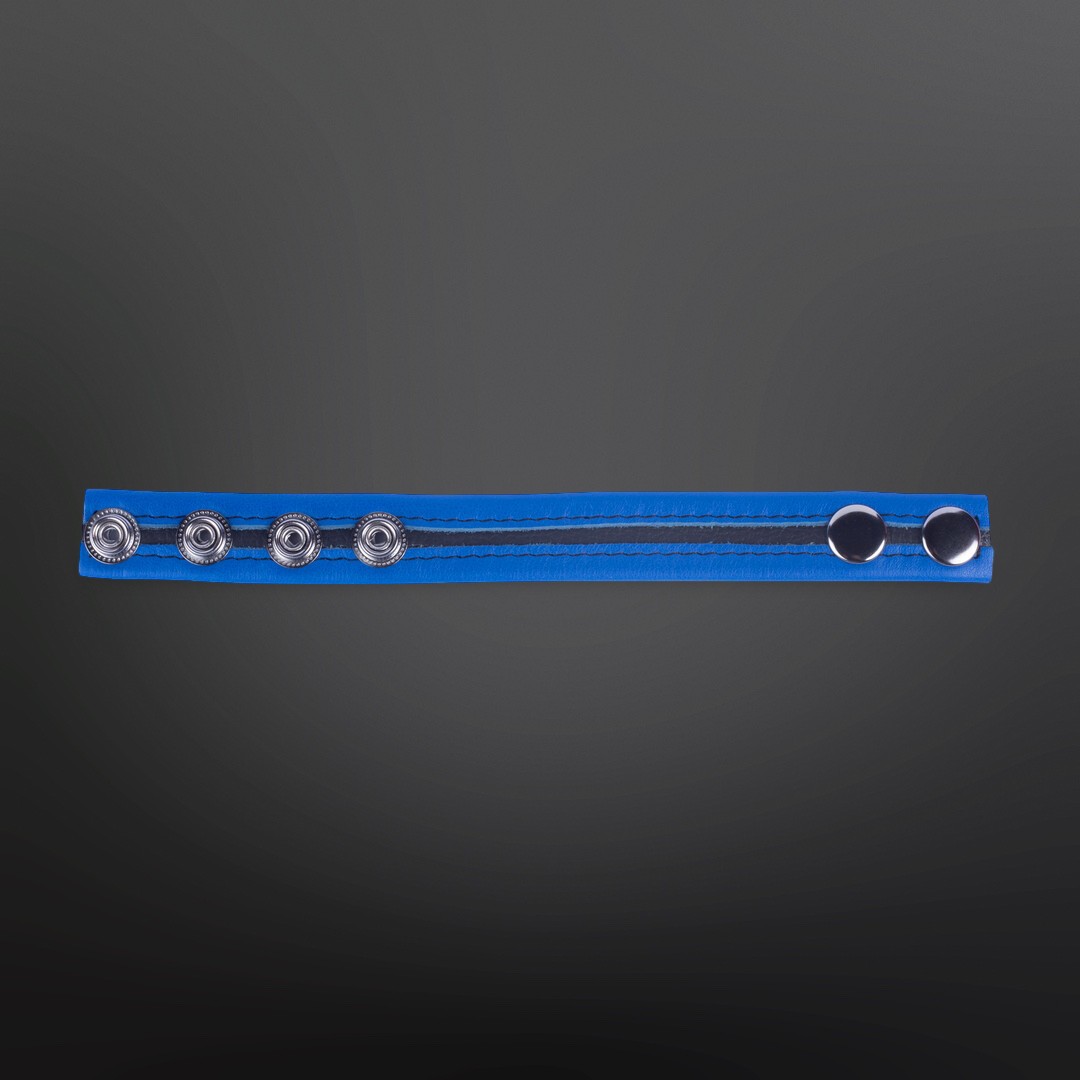 Bracelet cuir 2,3 cm avec pressions métal : tu règles le serrage en quelques clics et tu cales la base de la queue (ou queue + couilles) sans épaissir. Bande bleue soulignée d’une ligne noire pour un rendu net sous jean, slip ou jock.