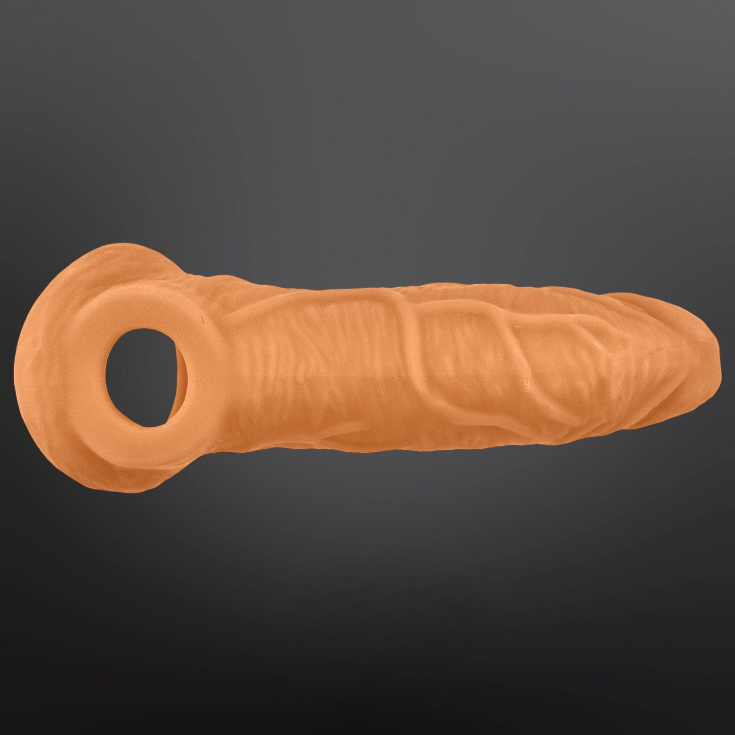 La marque Oxballs a développé ici une gaine en matière Skinz, un mélange souple, extensible et épais, conçu pour épouser la bite tout en ajoutant du volume. La cocksheath est creuse à l’intérieur, avec une cavité profilée qui accueille le sexe et le maintient bien dans l’axe. L’embouchure est renforcée pour un bon maintien à la base, limitant les mouvements parasites. L’extérieur est modelé avec une forme de queue massive : tête marquée, corps cylindrique épaissi, courbure légère pour un rendu très masculin. La structure reste flexible, mais suffisamment dense pour garder la forme même bien remplie. Le Skinz Peachy offre un toucher moelleux, légèrement rebondi, agréable en main comme sur le corps. Le design global reste fidèle à l’ADN Oxballs : look cru, efficace, pensé pour les mecs qui veulent un sexe plus large, plus long, plus présent.